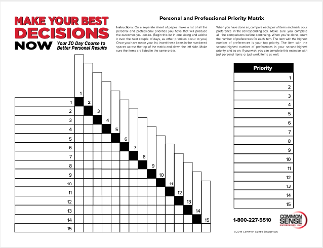 Your decision making skills determine your destiny. Don't lurch through life without taking time to clarify your priorities. This matrix is the perfect way to establish what is most important when making ANY significant decision. Use this matrix before: